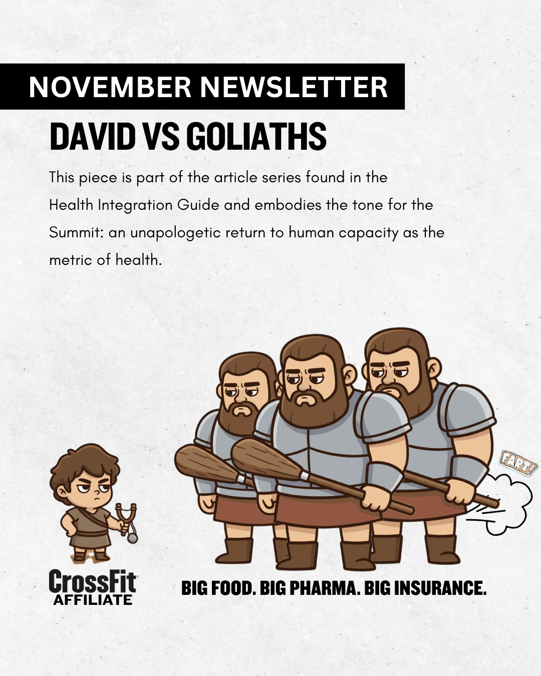 We are living inside a battle between Davids and Goliaths. But this time, the Goliaths aren’t made of flesh and armor—they’re systems: vast, soulless conglomerates of Big Food, Big Pharma, and the medical-industrial complex, all chained together by the invisible hands of insurance. Together they form a three-headed monster that feeds on human potential and sells it back to us as “healthcare.” It manufactures sickness, monetizes survival, and manipulates trust, turning both patients and providers into pawns in a game rigged for profit. This monster is cunning; it doesn’t roar, it whispers. It disguises itself as convenience, care, and coverage while it quietly drains our capacity to live freely and fully. And yet, standing small but unshakable in its shadow is the modern David—the CrossFit affiliate. Chalk-covered, scrappy, and fiercely human, the affiliate isn’t just a gym; it’s a rebellion. It’s where people reclaim what was stolen from them by a system that profits from decline. It’s where movement becomes medicine, and community becomes cure. Against the corporate giants that commodify illness, the affiliate stands for autonomy, truth, and human strength. And though the Goliaths loom large, they have one fatal flaw: they cannot compete with a community that refuses to surrender its agency.