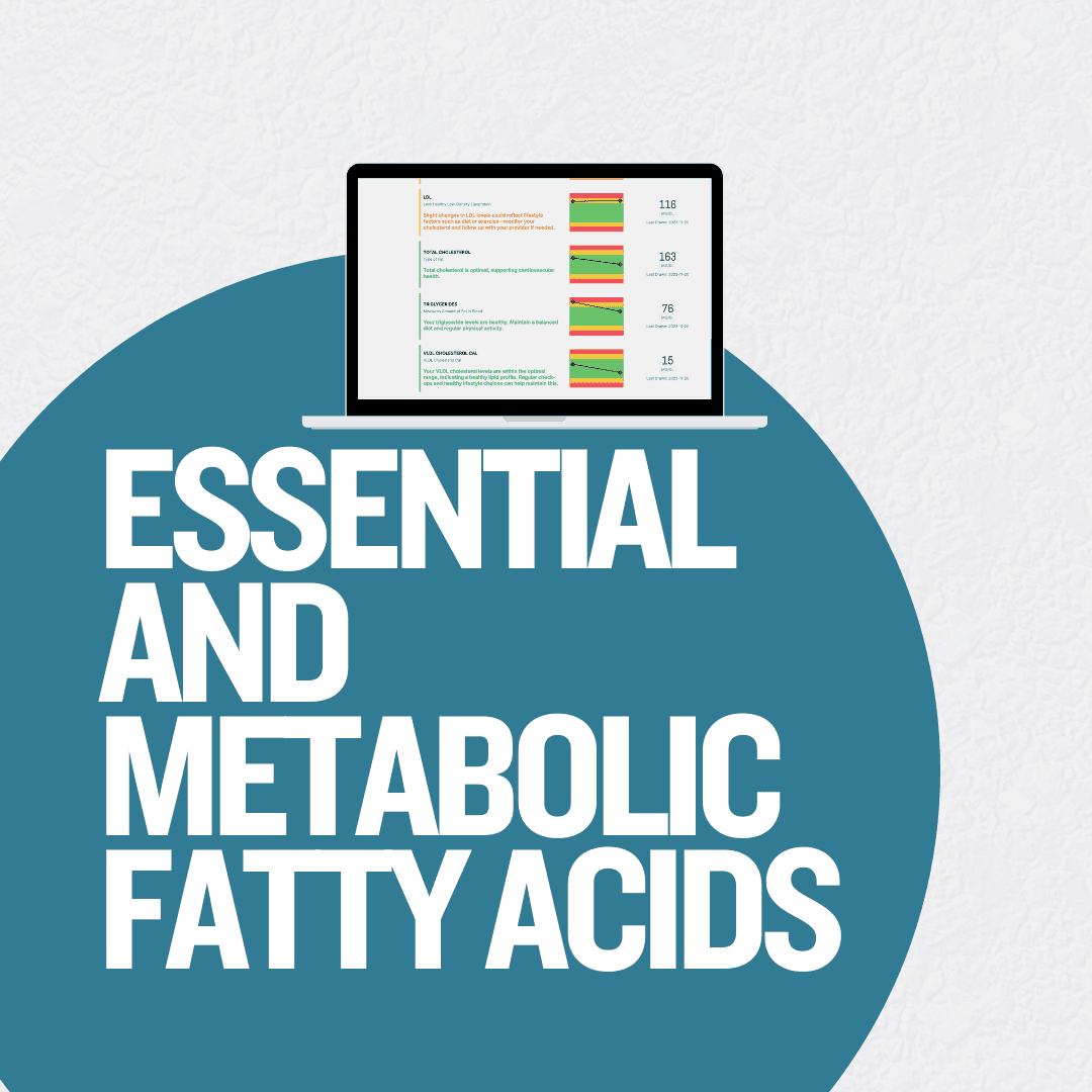 A blood-based fatty acid profile (often a finger-stick bloodspot) that measures the mix of fatty acids reflected in cell membranes, including omega-3s, omega-6s, omega-9s, saturated, monounsaturated, omega-7, and trans fats, then summarizes key balance metrics such as the omega-3 index (EPA+DHA), omega-6/omega-3 balance, and ratios like AA/EPA; it also reports an inferred enzyme activity marker (delta-6-desaturase activity, shown as a linoleic-to-DGLA relationship) and groups some results into a cardiovascular risk-oriented section to help guide diet and omega-3/omega-6 targeting and follow-up testing.