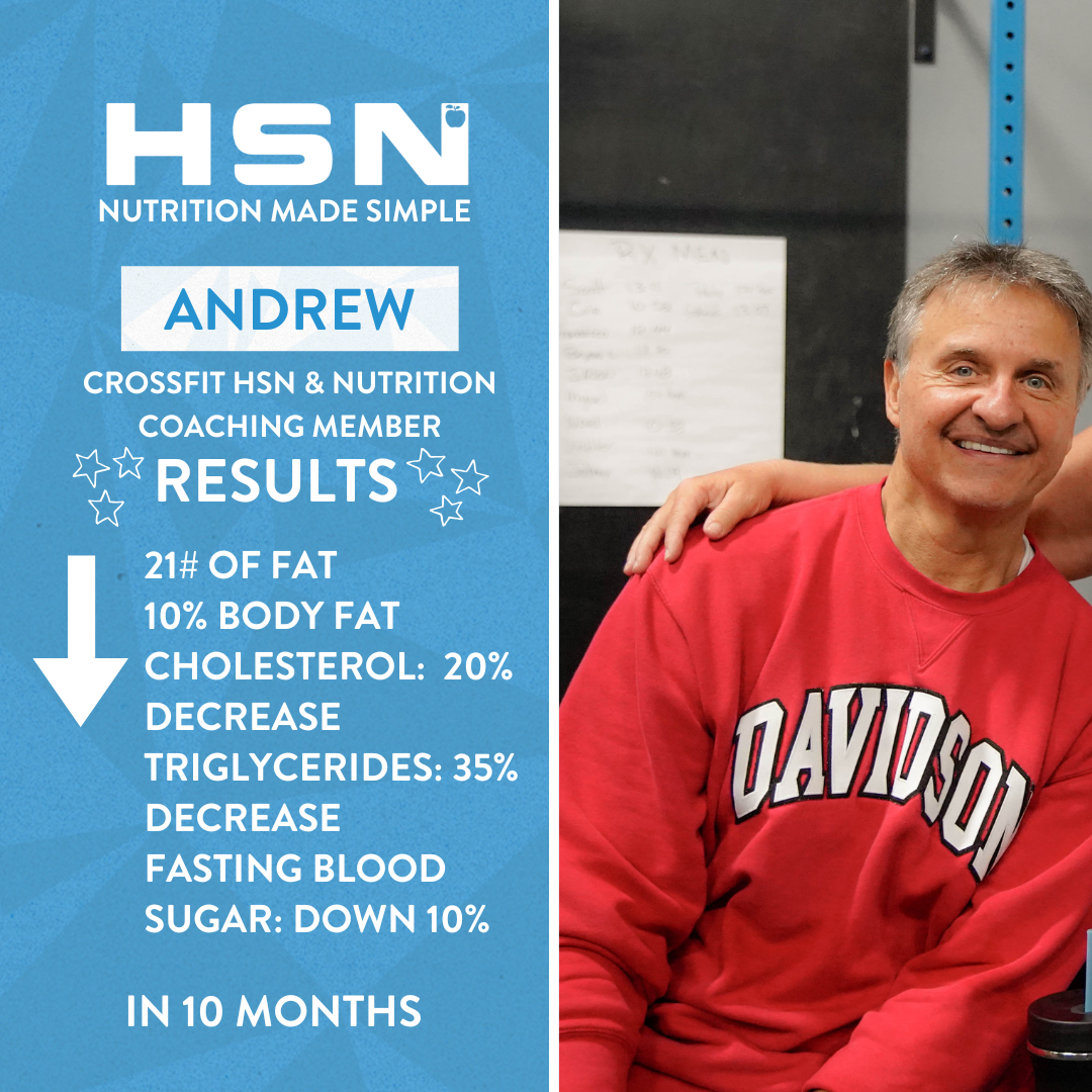 Andrew's triglycerides improved by 35%, fasting blood sugar by 10%, lost 10% body fat and 21 pounds of fat.